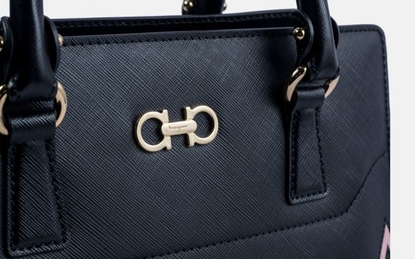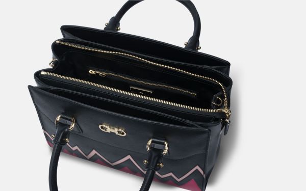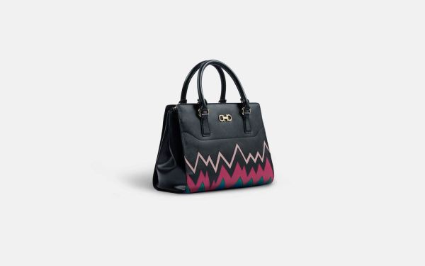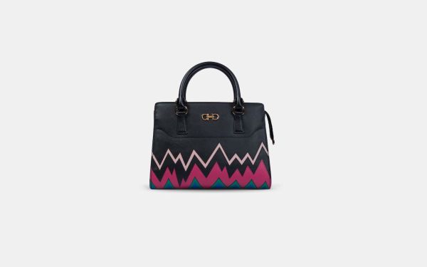 A vibrant colour block that’s remisicent of Salvatore Ferragamo prints from the 60s adds a splash of retro sophistication. This structured satchel can be carried as a shoulder bag or a handbag.